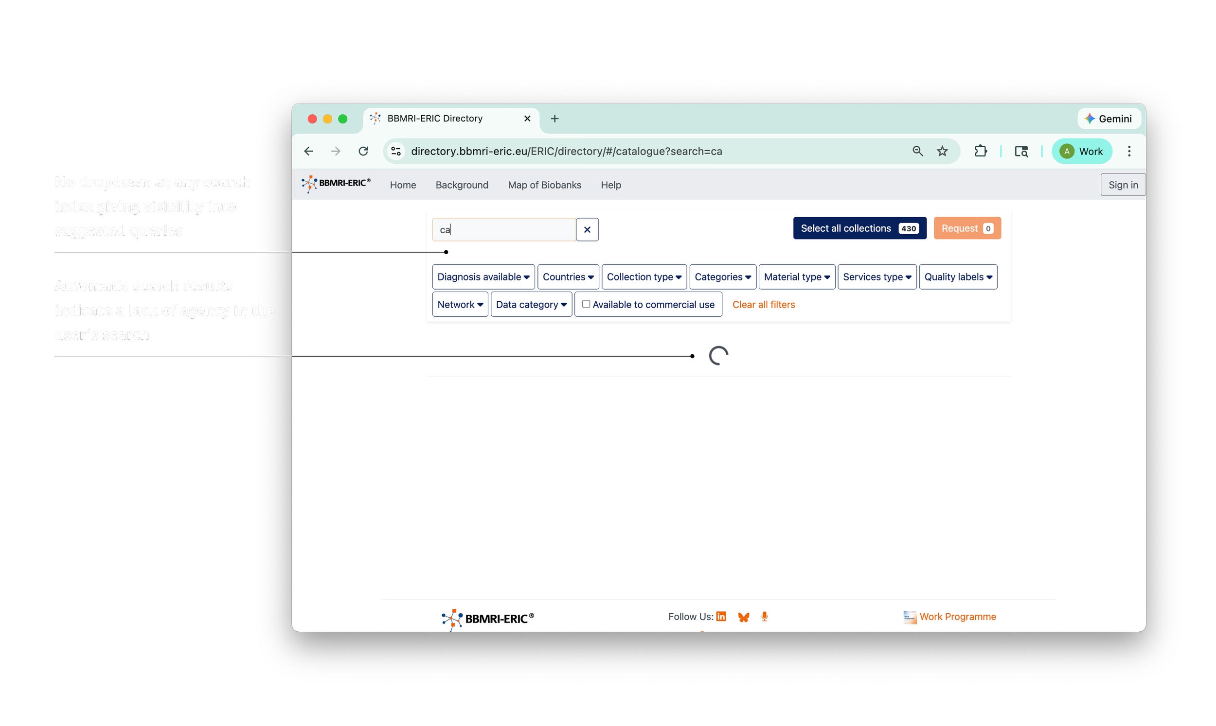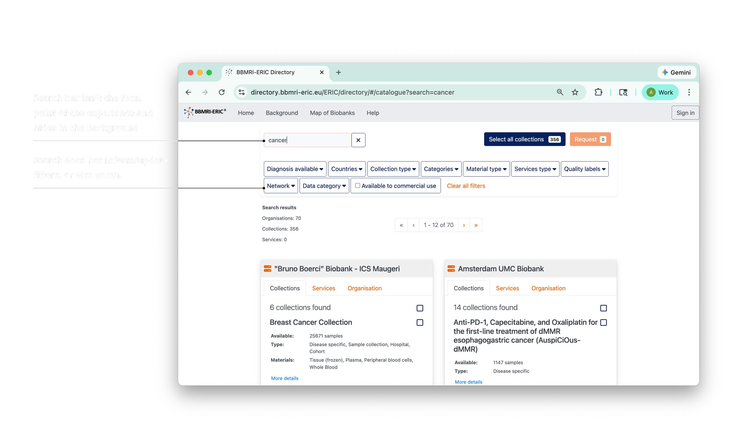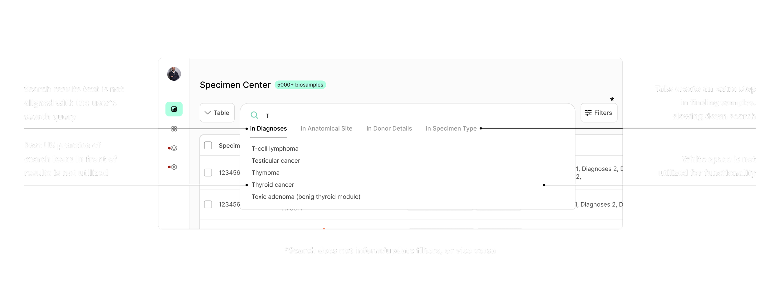 The search processes on these platforms revealed that both a) not surfacing possible diseases and b) having filter conflicts (i.e., anatomic site vs. sample type) slow down the search experience for procurers, who wish to find what they’re looking for within a matter of seconds.